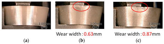 Figure 17. Tool wear progress for workpiece heated to 300 °C. (a) New tool; (b) After third pass; (c) After ninth pass.