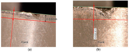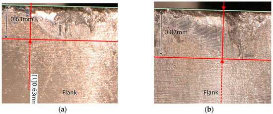 Figure 19. Enlarged views of tool wear for workpiece heated to 300 °C. (a) Third pass; (b) Ninth pass.