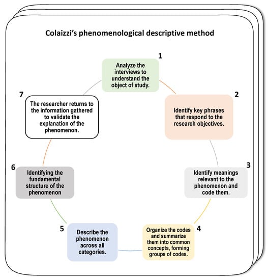 The method consists of 7 steps to develop rigorous analysis (see Figure 1). The final result is the description of the study object. For this, the interviewee experiences are important, from which key phrases are obtained that help to formulate such a description. These phases are as follows.