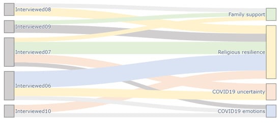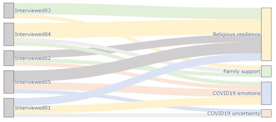 Figure 4 shows that spiritual resilience stands out the most from all the key sentence codes. Respondent 4 mentioned it the most in his answers, which is expressed by quantity flow 4. For example, he said: “no matter how difficult the road is, at the end of the day I am in God’s hands”; this phrase expresses the resilience that trust in God can generate. Likewise, words such as security, confidence, tranquility, and peace were used by this interviewee, which could have helped him to take a different attitude against the symptoms and complications of his disease.