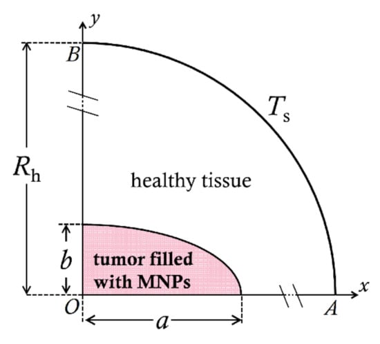 The left–hand side term in Equation (5) expresses the time rate of change of internal energy per unit volume. Τhe first term on the right-hand side of Equation (5) represents the heat conduction in the tissue. The second term represents an additional change in the internal energy per unit volume associated with blood perfusion in tissue, assuming that the rate of heat transfer between tissue and blood is proportional to the blood perfusion rate and the difference between the local tissue temperature and the blood temperature, as suggested in []. In addition, Qmet,n is the internal heat generation rate per unit volume associated with the metabolic heat production. Finally, Qs is the power dissipation density by the MNPs. It is assumed no leakage of MNPs to the surrounding healthy tissue. Therefore, Qs is only applied to the cancerous region filled with the MNPs, similarly to several earlier investigations, e.g., [,,,]. Following the assumptions by [,,,,], a uniform distribution of nanoparticles is assumed. The temperature of the surface of the healthy tissue region (see Figure 2), which is far away the tumor surface as explained in the previous section, is set to Ts = Tb [,]. For the initial temperature condition we set T(x,y,t = 0) = Tb. A symmetry (zero heat flux) boundary condition is applied on the x- and y-axes (line OA and line OB respectively in Figure 2). Also, heat flux and temperature continuity are considered on the tumor-healthy tissue interface as follows [,]: