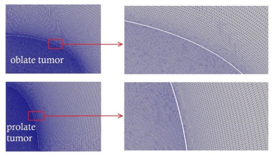 For the discretization of the computational domains, we used a combination of regular and unstructured meshes consisting of triangular cells. All meshes were constructed using GMSH software []. The unstructured mesh is used to discretize the tumor region as well as a healthy tissue layer around the tumor. We followed this approach to better capture the surface geometry of the tumors with high aspect ratios (e.g., AR = 8). Two sample meshes for AR = 2 are shown in Figure 3.