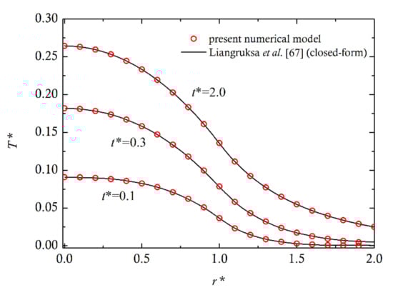 Comparison of the present computational results for various dimensionless treatment times with the closed-form solution by Liangruksa et al. []. T* is the dimensionless temperature, r* the dimensionless distance from the tumor center and t* is the dimensionless time, as defined in Liangruksa et al. [].