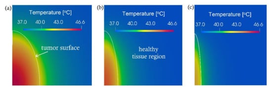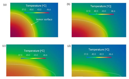 The hyperthermia of tumors is regarded as a viable treatment provided that the tumor locations are known and have not metastasized or when it is difficult to surgically remove the tumor, such as in liver cancer []. The ultimate treatment goal is to raise the tumor temperature above the physiological temperature for a certain time and to damage the malignant cells through several mechanisms such as protein denaturation, apoptosis and necrosis [], without significantly affecting the surrounding healthy tissue. In mild hyperthermia the tumor temperature usually ranges between 40–45 °C and typically above 50 °C for ablation therapy [,,,,].