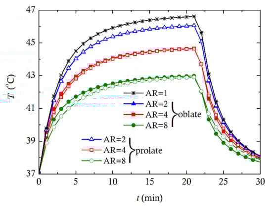 Figure 7 shows time-dependent temperature profiles at the tumor center for all the considered shapes. The AR value appears to have a significant effect on the tumor temperature evolution. At very initial times the temperature in the center increases rapidly and it is relatively independent of the aspect ratio and whether the tumor is an oblate or prolate spheroid. However, at intermediate times, the temperature becomes significantly dependent on the aspect ratio and it remains nearly insensitive to prolate or oblate spheroid shapes of the same AR. For instance, for AR = 1 after 22 min of treatment, the temperature is 46.62 °C, while for AR = 8 the maximum temperature is approximately 3.5 °C less for both prolate and oblate spheroidal tumors.