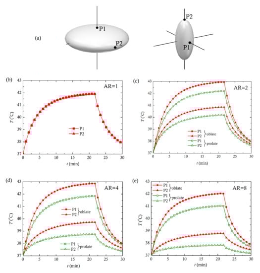Figure 8 shows the temperature values at two representative tumor surface probe locations as shown in Figure 8a. Observation point P1 is fixed on the tumor surface at the semi-minor axis and P2 fixed on the tumor surface at the semi-major axis. For a tumor with AR = 1, both probes give exactly the same temperature, as shown in Figure 8b. Of course, this is due to the perfect spherical symmetry for this tumor and has been shown by several other works. However, as shown in Figure 8c for a prolate and an oblate tumor with AR = 2, the treatment temperature as a function of time, at P1 and P2, differs significantly. While at the start of the treatment the temperature rises rapidly in a similar manner at both probe locations, after a relatively short time the temperature history at P1 is substantially higher than the temperature at P2. For the oblate tumor, after 22 min of treatment, the temperature at P1 is approximately 2 °C higher than the temperature at P2. A similar temperature difference is observed at the corresponding locations for a prolate spheroidal tumor of the same aspect ratio, but with lower treatment temperature values than the oblate. It should be also noted that for the oblate spheroid the temperature at P1 is higher than the temperature at the corresponding location of a perfectly spherical tumor (AR = 1), as compared to Figure 8b. For tumors with AR = 4 (see Figure 8d) the temperature difference between the two probe locations, after 22 min of treatment, increases to approximately 3 °C (for both oblate and prolate shapes), which is also in the case of tumors with an AR of 8 (see Figure 8e). As expected, due to the larger available surface for heat transfer, the temperatures for the case of AR = 8 are lower than for tumors with an AR of 4.