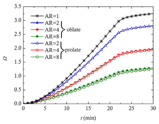 The thermal damage at the tumor center as a function of treatment time is shown in Figure 9. At the beginning of the treatment, the thermal damage of the malignant tissue at the tumor center is low and relatively unaffected by the tumor aspect ratio and whether it is a prolate or oblate spheroid. As the treatment time progresses, the highest thermal damage is observed in the tumors with AR = 1 and the lowest for tumors with AR = 8. For example, at 20 min of treatment the Arrhenius damage index is Ω ≈ 2.75 for AR = 1 and Ω ≈ 1 for AR = 8. The thermal damage evolution in the tumor center is generally independent of the tumor prolateness or oblateness, but it is strongly affected by the aspect ratio. Also, after approximately 22 min of procedure, Ω appears to be relatively stable for each aspect ratio. If we select the frequently quoted Ω = 1 threshold value above, which has a relatively high chance of causing irreversible damage the malignant tissue, we find that for AR = 1 this value is reached after approximately 10 min. of treatment. However, for AR = 8, more than 20 min of treatment are required to reach the Ω = 1 threshold value, and shorter times are required for tumors with smaller AR values.