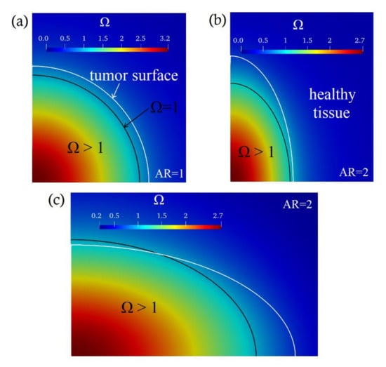 Figure 10 shows the Arrhenius integral Ω in the tumor for three representative geometries. Figure 10a is for AR = 1, Figure 10b for a prolate tumor with AR = 2 and in Figure 10c for an oblate one with AR = 2. For each case, the thermal damage in the central tumor region is higher than regions near the tumor surface, which is the direct result of the temperature distribution (see Figure 5 and Figure 6). To determine the extent of the damaged region in the ellipsoidal tumors, the frequently quoted Ω = 1 criterion is used as carried out by Eltejaei et al. [] and Andreozzi et al. []. In these studies, the boundary between the necrotic tumor area (Ω > 1) and the undamaged tumor region (Ω < 1) was determined using the Ω = 1 iso-contour. If we follow this approach in the sample tumor cases shown in Figure 10, we find that the location of this boundary is significantly affected by the aspect ratio and by whether the tumor is a prolate or oblate spheroid. Interestingly, for an oblate tumor of AR = 2, a small portion of the surrounding healthy tissue may necrose, which is not the case for a prolate tumor of the same aspect ratio.