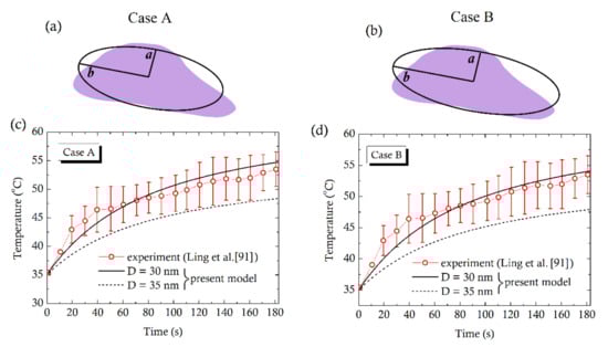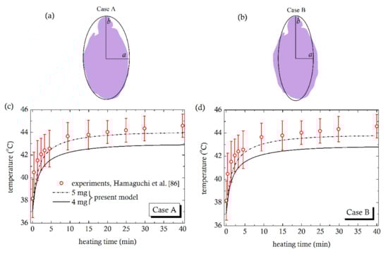 Two cases approximating the tumor shape from a histological cross-section by Hamaguchi et al. [], with a prolate spheroid. Note that the tumor histological cross-section has been redrawn from the original: (a) prolate spheroid shape, case A with AR ≈ 1.8, on top of the redrawn tumor and (b) prolate spheroid shape, case B with AR ≈ 2.2, on top of the redrawn tumor. Plots (c,d) show parametric comparison of the numerically determined temperature at the tumor center with the measured temperature by []. Temperature data points and bars are mean values and standard deviation respectively of 5 independent experiments.
