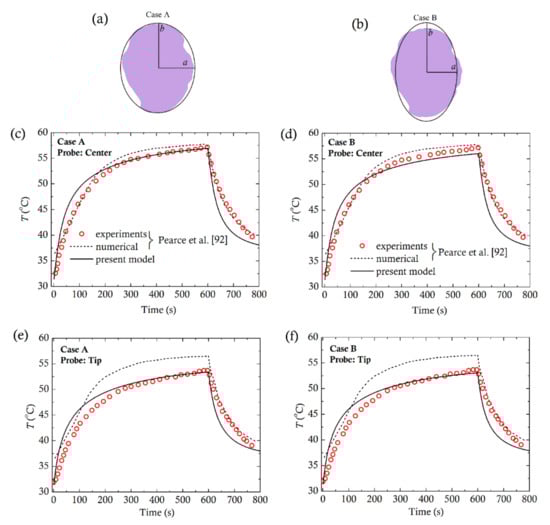 Two cases approximating the tumor shape from a histological cross-section by Pearce et al. [] with a prolate spheroid. Note that the tumor histological cross-section has been redrawn from the original: (a) prolate spheroid shape, case A with AR ≈ 1.29, on top of the redrawn tumor and (b) prolate spheroid shape, case B with AR ≈ 1.57, on top of the redrawn tumor. Comparison of the present numerical model with the 3D numerical model and experiments by Pearce et al. [] at the tumor center (probe center) for (c) Case A and (d) Case B and at the probe tip (approximately 3 mm from tumor center) for (e) Case A and (f) Case B.