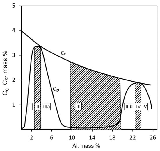 Aluminum, depending on its content in cast iron, promotes or prevents graphitization. It can act as a graphitizer or stabilizer depending on the quantity in which it is present in cast iron. Therefore, taking into account the widespread presence of aluminum in iron or steel scrap, it is possible to use this contaminated scrap for the production of high-aluminum cast iron [,,,], which should be used in the construction of machine elements. Fe-C-Al alloys, which contain up to 30% mass Al, show two characteristic ranges of graphitization. The first one includes alloys with up to 8 wt. Al, while the second alloys with a content of 18–26 mass % Al. With a content of 9–16 mass % Al and with a content exceeding 26 mass % with Al in cast iron, carbon is found only in the bound form [,,,]. Figure 1 shows the relation between the aluminum content in cast iron and the form of carbon occurrence [] and several areas can be defined, including [% mass]: