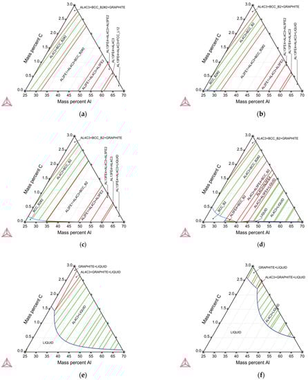 Phase equilibrium system of Al-Fe-C alloys obtained in the Thermo-Calc program for the following temperatures: 600 °C (a), 800 °C (b), 1000 °C (c), 1200 °C (d), 1400 °C (e), 1600 °C (f). Possible is to separate carbon in the form of graphite, starting from the carbon content of 2.5% (b–f).