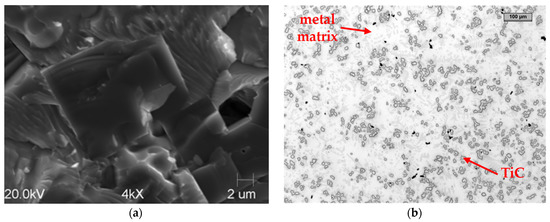 Precipitates of titanium carbides in SEM microstructure (a) and microstructure (LM) of high-aluminum cast iron with precipitates of titanium carbides (b).