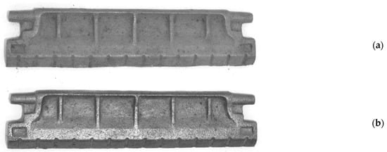 The PIT 30 medium frequency induction furnace with a thyristor inverter and a brick crucible, with a charge capacity of 30 kg was used to perform the melts. The melted alloy was superheated to 1540 °C and then cast-iron samples were cast at 1420 °C. A bentonite mass was used to make the molds, which is made of quartz sand-matrix, bentonite-binder, water, and coal dust as an additive. The molds were dried in a core and mold dryer at a temperature of 200 °C. In order to carry out the tests, three rollers with a diameter of 30 mm and a length of 260 mm were cast simultaneously in one mold. The so-called grate bars for a power boiler were also cast.