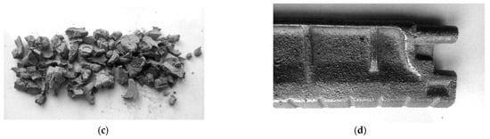 The furnaces of power boilers have belt grates with fully mechanized feeding and cleaning. The grate surface is made of separate cast-iron grates. This method of construction ensures that the drive chain articulated links are remote from the “heat”, and the gratings can be easily replaced. The fuel slides automatically from the coal basket onto the grate deck and moves along with it through the furnace. The grate bars are rotatably mounted in the pins in the so-called “Holders” attached to the grate chains. In the upper run, the grate strips overlap, while in the lower run they fall vertically, which allows them to clean from slag and ash. The mass of the burned fuel can be adjusted with the grate advance speed (max. 0.8 m/min.) and the thickness of the fuel layer, which (depending on the type of coal) is 50–150 mm. The grates in power boilers operate in very harmful conditions of use. The most unfavorable is the increased operating temperature, sometimes reaching 800 °C, and in some cases, e.g., in the event of a blower failure, much higher. The method of feeding the boiler by pouring solid fuel (coal), the hardness of which will affect the accelerated wear (“abrasion”) of the grate bars, is also important. The chemical effect of sulfur contained in coal (max. 0.6%) on the grate material also has a considerable influence. For research purposes, two castings were made (Figure 6a,b). The first (reference) with the chemical composition presented in Table 1 and the second one in Table 2. After about 14 days, signs of spontaneous disintegration of the first grate were noticed (Figure 6c), while the second grate, containing titanium carbide precipitates, Figure 6d, functioned for five years; it did not disintegrate, maintaining its glossy surface.