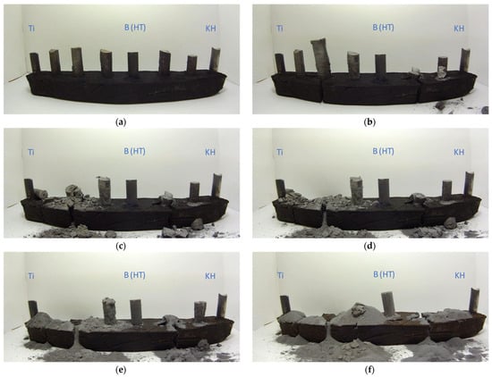 Self-destruction of different types of high-aluminum cast iron within 7 months after casting: Ti—titanium addition, B(HT)—boron modification and after heat treatment, KH—know-how of author; other samples were characterized by a variety of high-aluminum cast-iron structures consisting mainly of carbide eutectics Al4C3 and hypereutectic Al4C3 carbides. The images were taken over a period of four days (a), 40 days (b), 76 days (c), 112 days (d), 146 days (e), 184 days (f).