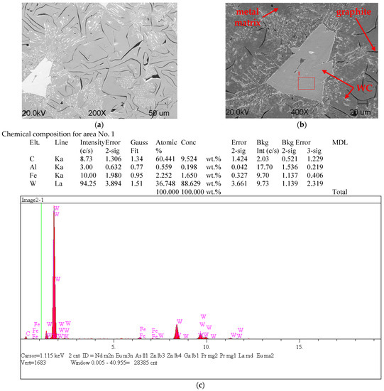 SEM microstructure of high-aluminum cast iron with the addition of tungsten (a,b) and EDS X-ray microanalysis of carbide precipitation with a chemical analysis of tungsten carbide (c).