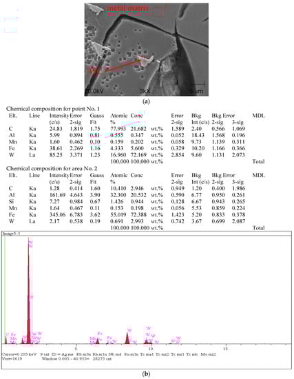 No aluminum carbide was found in the tungsten sample either, which shows the effect of the complete replacement of the aluminum carbide with tungsten carbide. Figure 7 presents the morphology of WC carbide precipitates in the alloy and their chemical composition. Moreover, graphite is present in the structure of the obtained high-aluminum cast iron.