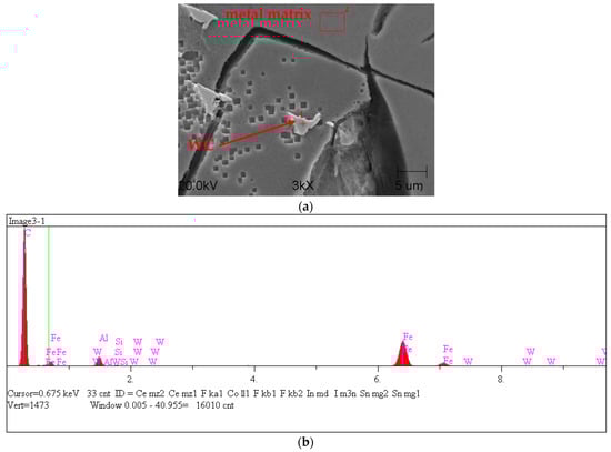 SEM microstructures of high-aluminum cast iron with the addition of tungsten (a) graphite in the structure and its EDS X-ray microanalysis (b).