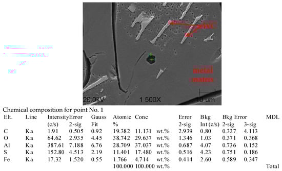 SEM microstructure of high-aluminum cast iron with the addition of tungsten with a chemical composition analysis for no. 1 oxide particle.