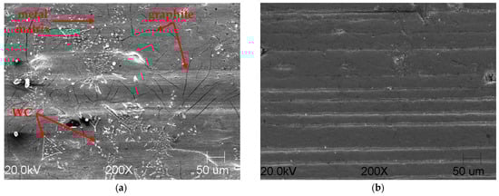 SEM images of high-aluminum cast iron with the addition of tungsten (a) and SEM images of high-chromium cast iron (b) after a full abrasion test with the Miller machine.