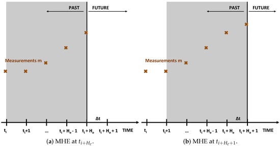 Moving horizon estimation (MHE) estimates states and parameters at a point in time from the measurements at this time point and the measurements at the previous time points. Hence, an estimation horizon of measurements is used for the state and parameter estimation. Once a new sample is taken at , the estimation horizon moves one time step, meaning that the measurements at are used for the state and parameter estimation while the measurements related to the first point of the previous horizon (i.e., ) is discarded [12,13,14]. This is also illustrated in Figure 1.