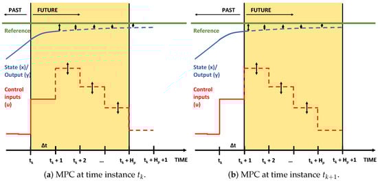Model predictive control (MPC) solves an open-loop dynamic optimization problem over a time interval , with as the prediction horizon to optimize the future of a process. The novel obtained measurements and state and parameter estimates at are used as initial conditions for the open-loop dynamic optimization problem that is solved at every iteration. This principle is illustrated in Figure 2: based on the state estimate or measurement at a dynamic optimization problem is solved over the time interval (a). The solution is applied to the process until a new measurement at is obtained and then a new dynamic optimization problem is solved over (b).