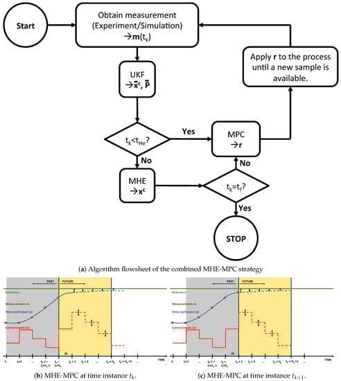 Overview of the combined MHE-MPC strategy: (a) algorithm, (b) combined MHE-MPC at , and (c) combined MHE-MPC at .