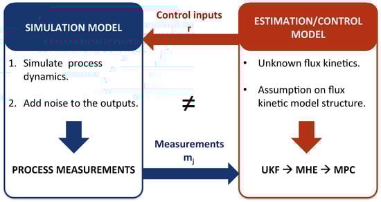 The proposed combined MHE-MPC strategy for metabolic network model-based predictive bioprocess control has been implemented on a CSTR bioreactor using a low-complexity metabolic network. The general setup for the implementation of this case study is shown in Figure 4. Two different models are used: (i) the simulation model, which gives the process dynamics, and to which output noise is added to get the process measurements, and (ii) the estimation/control model, which is an approximation since the process model is not known. It is important to note that only the flux kinetics are assumed to be unknown in the estimation/control model. The metabolic reaction network in the estimation/control model is for this case study the same as the one used in the simulation model. Additionally, the general model structure, i.e., the transport terms, etc., are the same for both the simulation and the estimation/control model.
