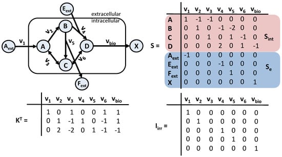 with as the () matrix of parameters that define the linear relationship between fluxes and metabolite concentrations. This results in nine parameters to be identified.