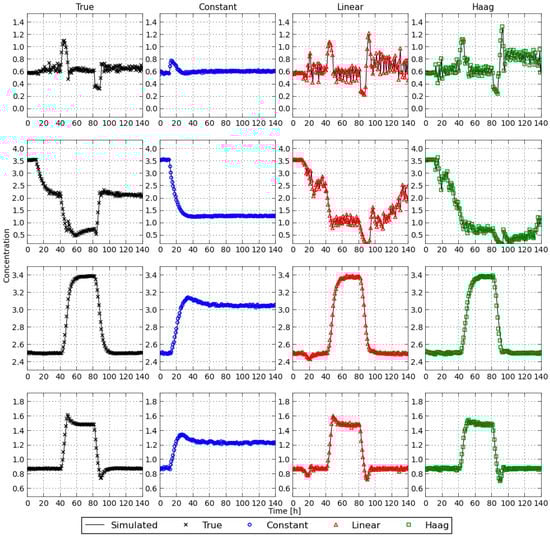 It is expected that a higher sampling frequency will result in better tracking. This corresponds with lower sampling times . In Figure 12 this is only observed for the true model. For the linear model this is the case for all states, except F. In the Haag model, this is not observed for E. A lower sampling frequency only results in a better tracking for the constant flux model for A.