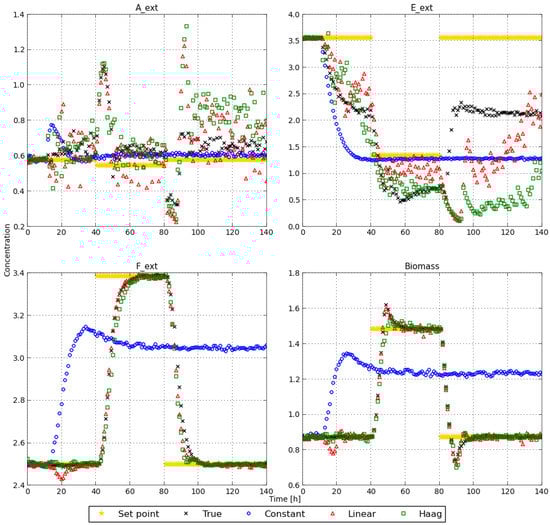 In Figure 7 the extracellular metabolite concentration profiles (i.e., the state profiles) are depicted for the different methods, together with the set point that is used for the different concentrations during the MPC procedure. For the extracellular metabolites that are consumed, i.e., A and E, the set points are better tracked by the true flux model and the constant flux model than by the linear and Haag models. The extracellular metabolites that are excreted (or produced) by the cells are better approximated with the true, linear, and Haag flux models. These observations are made from Figure 7.