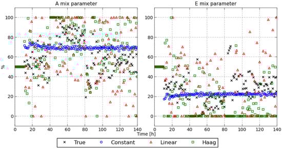 Initially, the CSTR bioreactor is studied over a period of 140 h with a sampling rate of 1 h, resulting in 140 simulation intervals. During the first 10 h, a constant ratio of 50% A and E is fed to the CSTR reactor. A horizon length of 4 h has been selected for both the estimation horizon as the prediction horizon (i.e., h, corresponding to 20 intervals). This means that after 4 h, the first MPC control action is applied to the process. Moreover, the set point for the MPC is defined as follows: