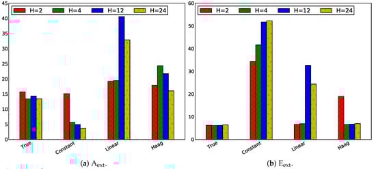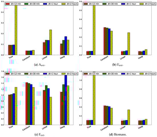 Contrary to the previous paragraph, the estimation horizon is varied and the prediction horizon is kept constant at 4 h. Following estimation horizons have been studied for a sampling rate of 1 h: , (4 h), , . In Figure 11, the absolute values of the absolute tracking error are displayed.