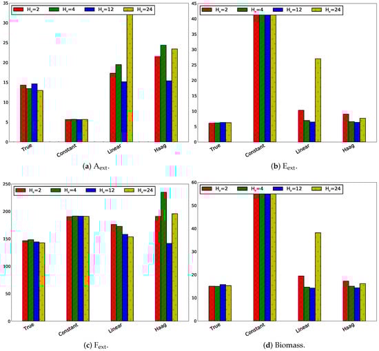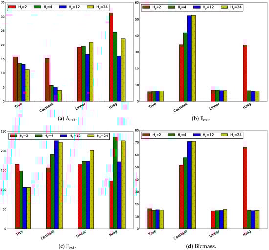 Firstly, the influence of the horizon length on the tracking performance is studied by selecting the same horizon for estimation and prediction (control): . Four different horizons have been simulated, assuming that a sample is taken every hour: , , , . The absolute values of the absolute tracking error for all states are depicted in Figure 9.
