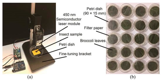 The observation platform was set to observe the changes of P. rapae after irradiation (Figure 1b). Chemical-free broccoli leaves collected from a field of broccoli plants were cut into a circular disc with a diameter of 56 mm. The filter paper and broccoli leaves were replaced every 24 h. One larva was placed in each petri dish. During culture, the dishes were maintained under conditions of 25 °C, 85% humidity and a 16 h light/8 h dark regime [28].