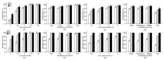 The results from the laser irradiation tests with single working parameters are shown in Figure 2. The mortality of the control group was not adjusted because no larvae died within 72 h. The larvae were collected for tests from 5 October 2019 to 2 April 2020.