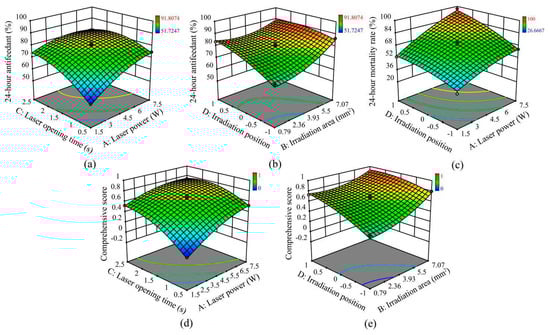 In this case, A, B, C, D, AC, BD, A2, B2, C2 and D2 were found to be significant model terms (p < 0.05). The effect of laser power (A) on the comprehensive score was the most significant (F = 161.94, df = 1, 13, p < 0.0001). The interactions AC (laser power and laser opening time; F = 9.28, df = 1, 13, p = 0.0073; Figure 3d) and BD (irradiation area and irradiation position; F = 6.66, df = 1, 13, p = 0.0195; Figure 3e) exerted more significant positive impacts on the comprehensive score than the other interactions. The R2 value was found to equal 0.9740, which indicated a realistic fit of the model to the experimental data. This finding also indicated that 97.4% of the variation in response could be elucidated effectively and showed that 2.6% of the variations occurred when the tests were performed [40]. The predicted R2 (0.9241) and the adjusted R2 (0.9573) values were within 0.2 of each other, whereas adequate precision values were greater than 4, which indicated a satisfactory model fit [39].