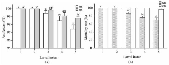 Antifeedant percentages (a) and mortality rates (b) (Mean ± SE) of 1st- to 5th-instar P. rapae larvae in optimal working parameters tests. Bars with the same letters indicate no significant difference among the tested groups within each observation time (ANOVA followed by Tukey’s honestly significant difference test, p > 0.05), while test between different observation times cannot be compared with each other.