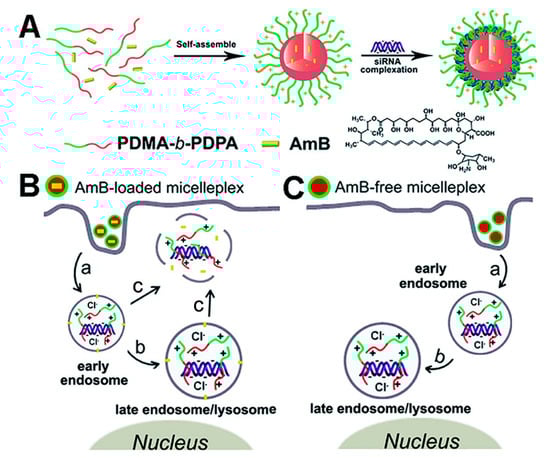 - Yu, H.; Zou, Y.; Wang, Y.; Huang, X.; Huang, G.; Sumer, B.D.; Boothman, D.A.; Gao, J. Overcoming endosomal barrier by amphotericin B-loaded dual pH-responsive PDMA-b-PDPA micelleplexes for siRNA delivery. ACS Nano 2011, 5, 9246–9255. [Google Scholar] [CrossRef] [Green Version]