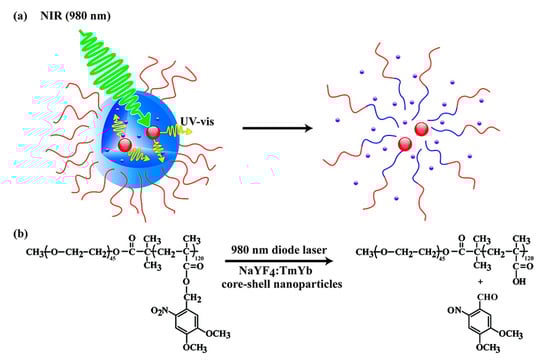 - Yan, B.; Boyer, J.C.; Branda, N.R.; Zhao, Y. Near-infrared light-triggered dissociation of block copolymer micelles using upconverting nanoparticles. J. Am. Chem. Soc. 2011, 133, 19714–19717. [Google Scholar] [CrossRef]