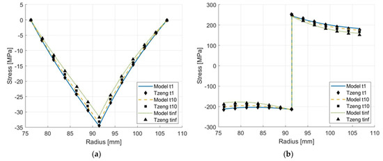 Radial (a) and circumferential (b) stress distribution comparison between the current model and Tzeng et al. [13] for a two-rim press-fit CFRP flywheel rotor.