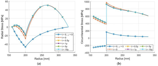 Simulation results in terms of radial and circumferential stress are shown in Figure 3 for the flywheel rotor constructed from an aluminum hub with a thick CFRP rim. While the hub, located between r = 160 mm and r = 200 mm, was not inherently subject to viscoelastic behavior, its stress state changed as compressive loading from the composite rim decreased.