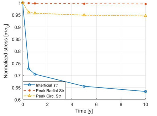 Regarding the composite rim, radial and circumferential peak stresses are predicted to decrease moderately between 1% and 5.5%, respectively, over the 10-year simulation period, which is to be expected based on previous research [14]. For greater clarity, peak stress values in the rotor over the simulated 10-year period were determined for (i) the interfacial pressure measured in the radial direction, (ii) the radial stress, and (iii) the circumferential stress. Corresponding values are given in Table 4. To illustrate their change over the simulated operation, they were normalized by their initial value at t = 0 and plotted in Figure 4. Within the first year of (continuous) operation, the rotor undergoes viscoelastic stress changes as the interfacial compressive stress decreases from −27 MPa to −19 MPa, or approximately 70.4% of the initial value. After 1 year, interfacial compressive stress decreases at a reduced rate, decreasing to 63.3% after 10 years. These results indicate that the composite material experiences rapid non-linear relaxation over the first year of operation, which to a large extent is ascribed to primary or transient creep (phase I). In the subsequent years of the rotor’s service life, stress relaxation is significantly reduced, indicating the material has fully transitioned into secondary or steady-state creep (phase II). Conceivably, the initial rapid relaxation could be avoided by subjecting the composite rim to a suitable conditioning process prior to rotor assembly. In this case, only a relative minor decrease in interfacial pressure of about 7% would be expected.