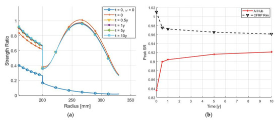 The CFRP rim initially has the highest SR of 1.01 and is located at the midplane of the rim; however, viscoelastic stress relaxation improves the stress state of this rim, so SR decreases to 0.975 within 6 months, then continues to slowly decrease to about 0.96 after 10 years. The same cannot be said for the aluminum hub, which exhibits an evolution of stresses approaching failure. The SR for the hub, while initially substantially less than the composite rim, increases from 0.836 to 0.9 within 6 months, then continues to increase to 0.92 over the following 10 years. With an increase by 6.8%, changes in SR for the hub are rapid in the first year of operation, while the SR is predicted to increase by only another 2% over the next 9 years. Referring to Figure 3, this SR growth is caused by a rising circumferential stress in conjunction with a lessening of compression in the radial direction. This behavior can be understood recalling Equation (13), which is composed of radial, circumferential, axial, and coupled terms. The linear term for radial direction is . Since the peak radial stress is compressive, a large negative value is introduced into Equation (13), thus reducing SR accordingly. As the CFRP rim undergoes viscoelastic deformation, the radial compressive load diminishes, so SRradial diminishes as well, thus removing the negative term from the equation, causing the observed SR increase for the hub.