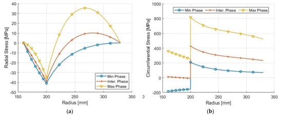 As mentioned earlier, the load profile for case 2 is intended to more closely simulate the operation of an FESS in actual applications, such as for solar PV electric grids or EV charging. Graphs with the radial and circumferential stresses on day 1 of operation are given in Figure 6. These graphs serve as representative examples of the stress distribution for the simulated operation. While the magnitude of the radial and circumferential stresses was found to decrease in the rim and increase in the hub over time, the overall shape of the stress response at each velocity (minimum phase, ωPmin, intermediate phase, ωPint, maximum phase, ωPmax) was found to be similar for any day of the simulated operation, so only data for the first day are provided. Comparing case 1 (Figure 3) and case 2 (Figure 6), the stress responses at ωPmin and ωPmax closely resemble those from case 1 at t = 0, ω = 0 and at t = 0, ω = ωlimit, respectively, as is expected given the similarity between angular velocities and the non-linear relationship between stress and velocity. Notably, for both cases, the circumferential stress in the hub is seen to change from initially having a positive slope (ω = 0, ω = ωPmin) to having a negative slope at high-velocity operation (ωlimit, ωPmax). Between both extremes, stresses switch from tensile to compressive with the magnitude occurring at the hub inner surface. This loading scenario resembles fatigue loading with a negative stress ratio, positive mean stress, and a comparatively high stress range. The hub design should therefore include a fatigue analysis, especially for FESS that experiences high cycle rates, i.e., numerous cycles per day.