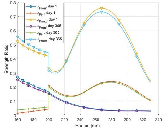 Figure 7 depicts SR data for all points along the rotor radial direction at each velocity for day 1 and day 365. Again, while magnitudes at each point are seen to vary for the different velocities, the overall shape of the SR curves at each velocity bear distinct similarities. Broadly, SR graphs exhibit similar trends as in case 1. After year 1, SR values at ωPmax increase in the hub but decrease in the composite rim. As one would expect, SR values in Figure 7 are lower compared to data in Figure 5, due to the overall lower stress levels and the reduced time that the rotor operates at high velocity.