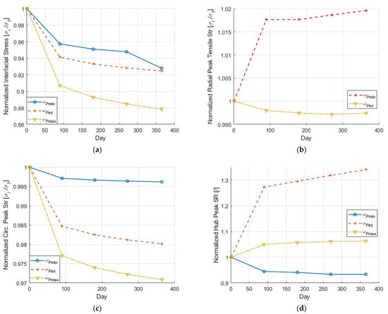 Stress results normalized by their initial value on day 1 for (a) interfacial pressure, (b) peak radial tensile stress, and (c) peak circumferential stress in the CFRP rim, (d) peak SR in the aluminum hub, and (e) peak SR in the CFRP rim.