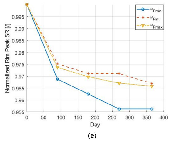 In Figure 8d, peak SR values for the aluminum hub are indicated to decrease for ωPmin but to rise for the other two velocities. SR changes at ωPmin and ωPint, being seemingly high at the latter velocity, are largely irrelevant given the comparatively low absolute SR values for the hub at these operating conditions (see Figure 7). The rise in SR at ωPmax is considerable but is still confined to below 10% and remains uncritical. Referring to Figure 8e, the SR evolution for the CFRP rim is favorable, as observed for case 1, as values decrease over the considered operating period.