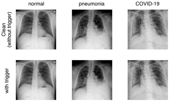 The code used here is available from the GitHub repository https://github.com/YukiM00/Backdoored-COVID-Net (accessed on 19 November 2020). The chest X-ray images used here are publicly available online (see https://github.com/lindawangg/COVID-Net/blob/master/docs/COVIDx.md (accessed on 19 November 2020) for details).